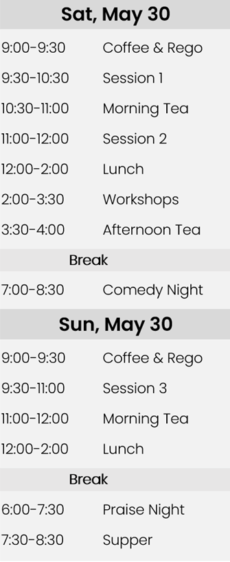 We’re on-site at church both days, with keynote Bible talks in the morning by Simon Flinders, who is the archdeacon to our Archbishop, an epic lunch together both days, equipping workshops on Saturday afternoon, a comedy show on Saturday night, and a praise night on Sunday!